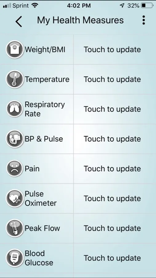 -Health Measures: Track and monitor (tabular and chart formats) a broad set of Health Measure readings, including Blood Pressure, Blood Glucose, Weight/BMI, Cholesterol, Peak Flow. Pulse Oximeter and Temperature.