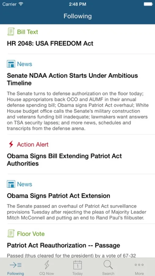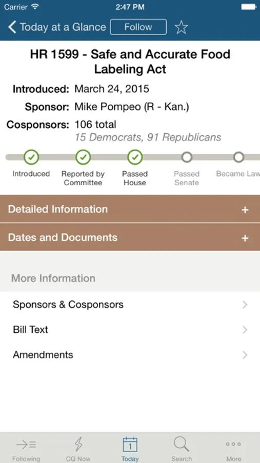 We’ve selected key features from CQ+, our premium platform, to include in the CQ app. Follow and unfollow bills, issues and people directly from the app, set up push alerts that’ll be sent directly to your device when the bills you care about change status, and enjoy synchronized alerting between all the products in your CQ package.