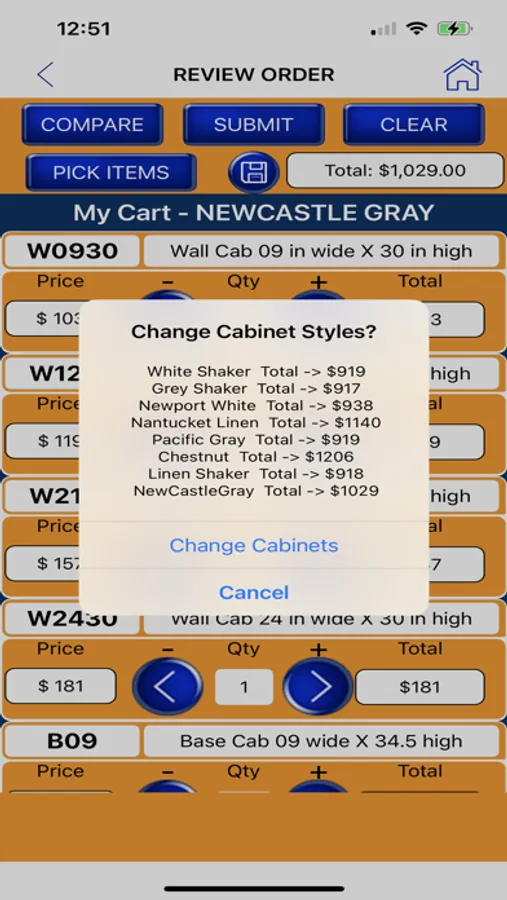 (2) Use our Compare feature to compare pricing of your complete kitchen design layout with all of our great cabinet styles!