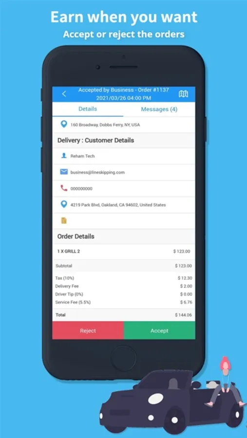 Know how much you will earn on each delivery and the distance prior to accepting the order right from the app.