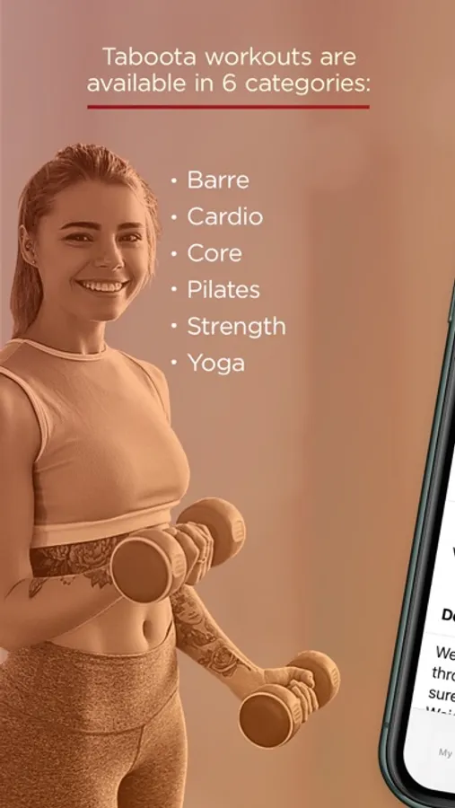 Taboota workouts are available in 6 categories — Barre, Cardio, Core, Pilates, Strength, Yoga.