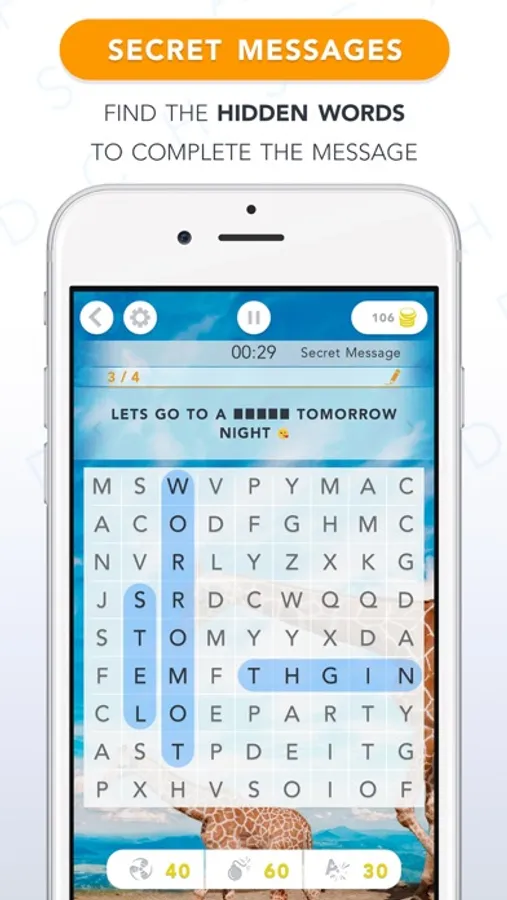 Create a message and send it to your friends and family. They will be challenged to find the hidden words to complete your secret message. See who can solve the puzzle first! You can send funny or romantic messages to your loved one, riddles, birthday wishes... whatever you think of!