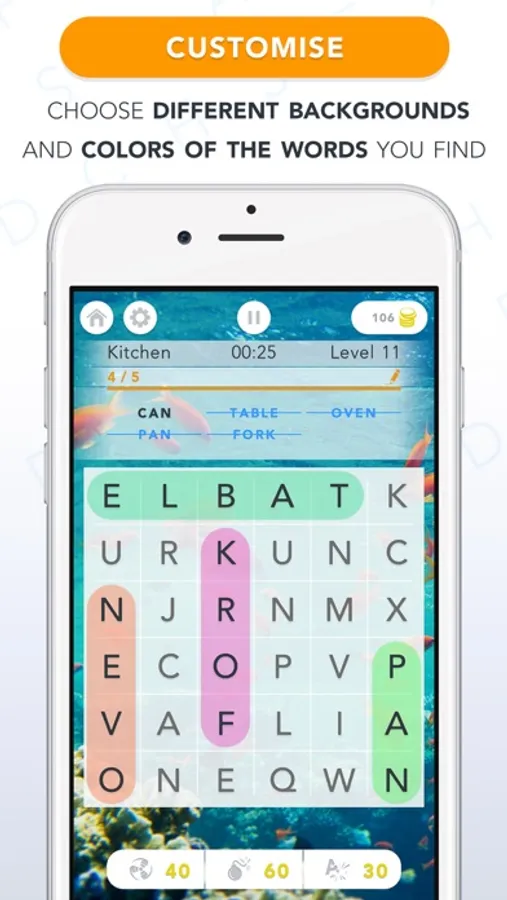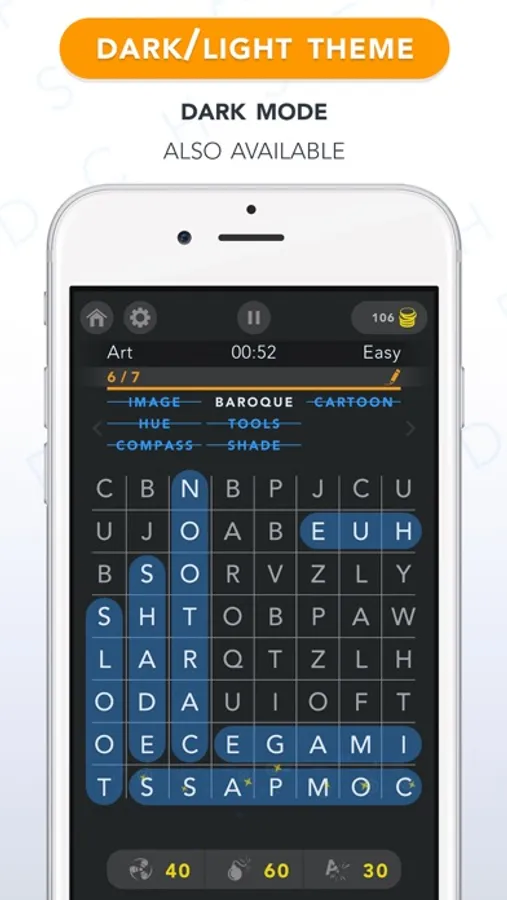 Plus, if you enjoy adding a personal touch to your game, choose between different backgrounds or customize the grid and colors of the words you find. Dark mode also available.