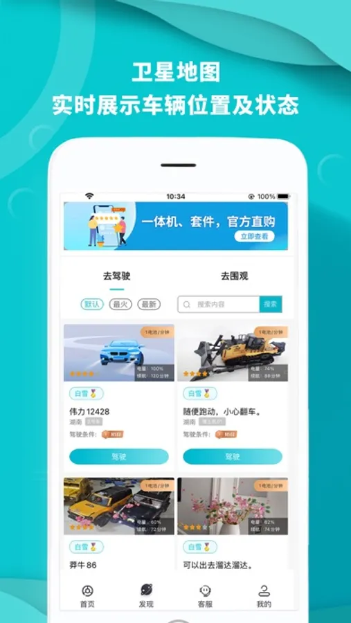 实暻飞车共享版APP与遥控车配套使用,足不出户,发现生活更多精彩,满足你对遥控车的更多想象。主要功能包括:1、选择不同特色景区线路,选择不同型号车辆;2、实时的地图视角和车辆驾驶时间、速度、电池电压及电量等参数展示;3、超视距网络远程遥控,实时高清画面展示,并可操控车辆方向、油门、高低速、差速锁语音等功能。