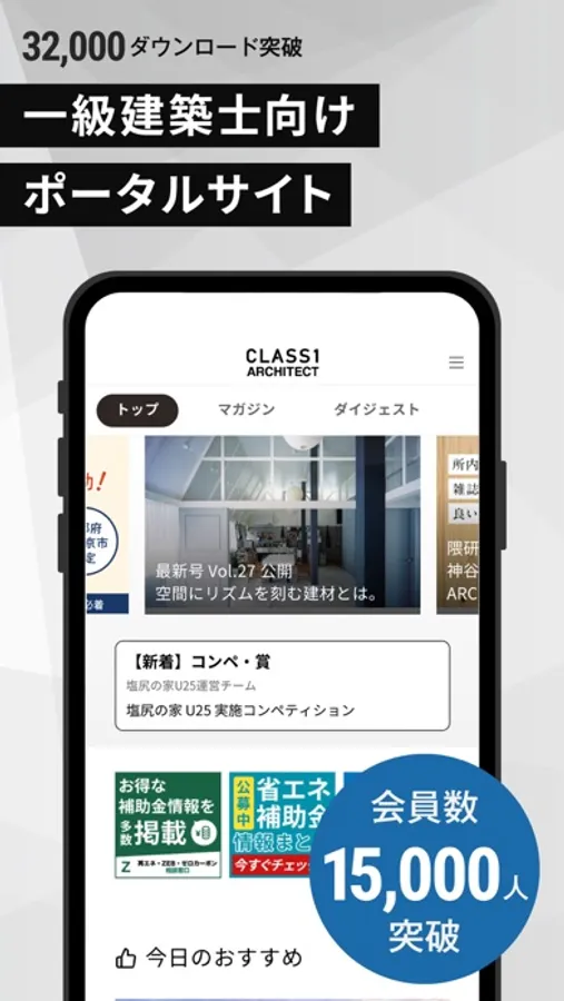 「CLASS1 ARCHITECT」は現在ダウンロード数33,000、会員数は16,000人を超え、全国の建築士・施主の方々にご利用いただいています。新聞や雑誌では知れなかった建築・建材情報がわかるサービスとして、ぜひご利用ください。