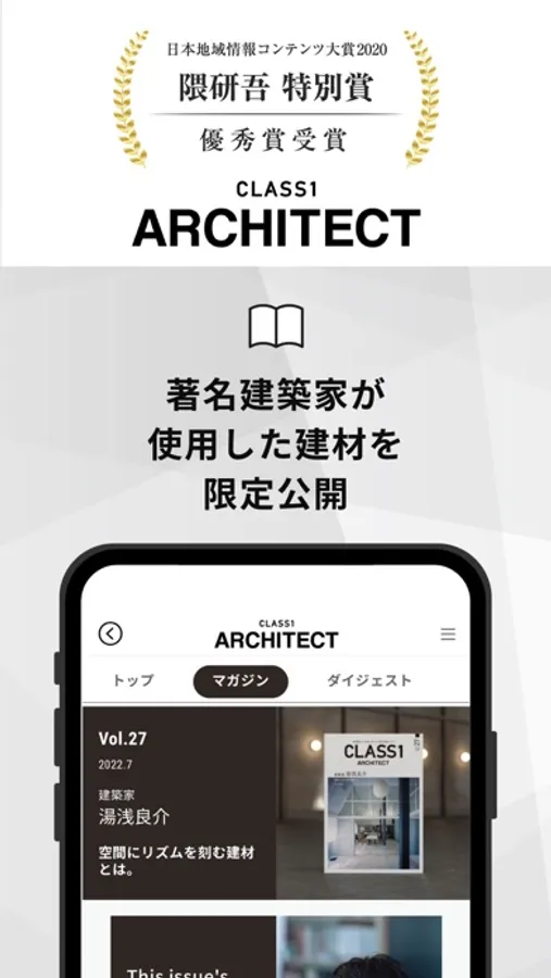 著名建築家が使用した建材を無料公開。このアプリのメインとなる人気企画です。著名建築家が建材を選ぶポイントや活かし方を、いつでも、どこでも無料で読むことができます。