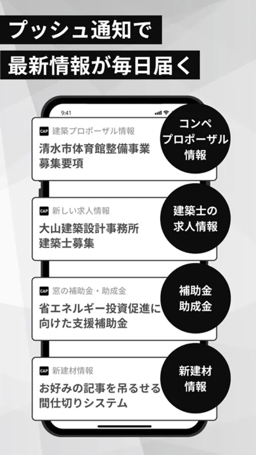 最新の建築・建材情報を毎日収集。設計プロポーザル情報や住宅・非住宅で使える補助金、建材メーカーの新商品情報など、建築士が知りたい情報をすべてチェックできます。