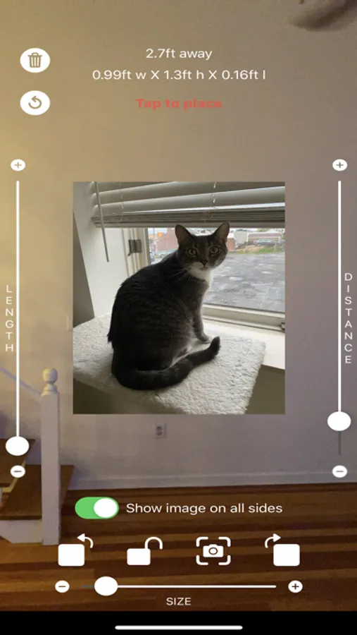 Either select a saved photo or take a new one. Once an image is selected, you can place the image in 3d space and interact with it as if the image was in the real world.