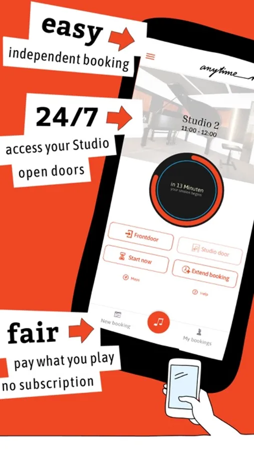 With the Anytime Music App you choose your studio, book and open doors, extend your booking, pay. Independent and flexible – in english, german, japanese and italian.