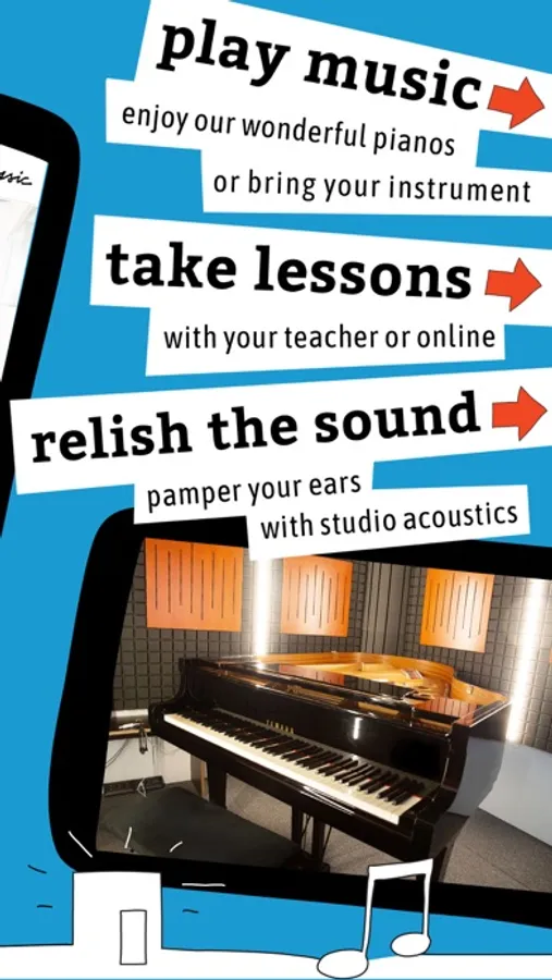 Play our beautiful manufacture pianos or bring your instrument. Give or take classes, practice music or anything else you need such great acoustics for.