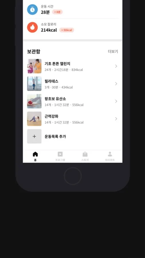 가벼운 스트레칭, 근력, 필라테스, 유산소 등 집에서 시작하세요.