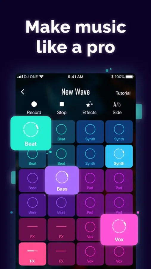 The life of a DJ is already with you with the DJ Pad! Create your own unique music, use your favorite styles and cool effects!