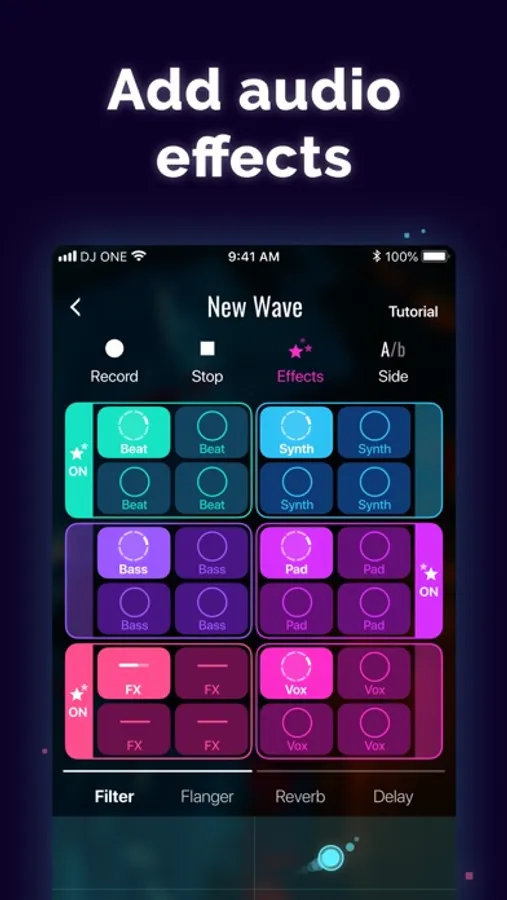 - Popular FX effects: filter, flanger, reverb and delay. Professional effects for professional DJs.