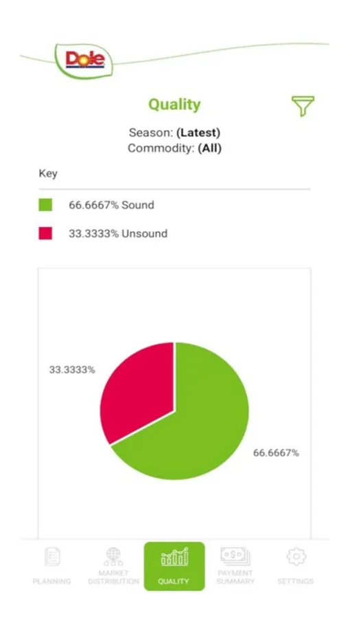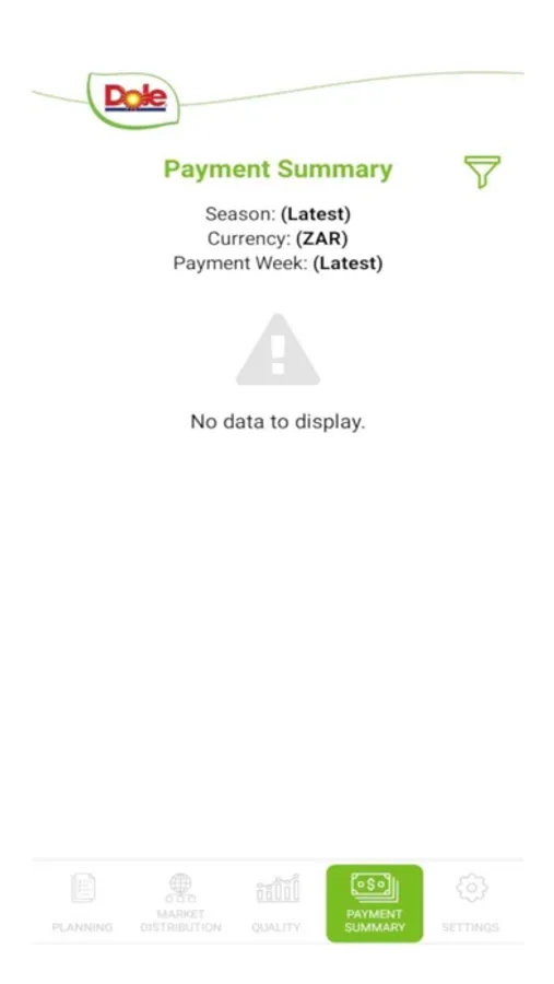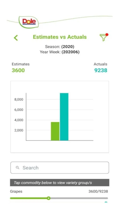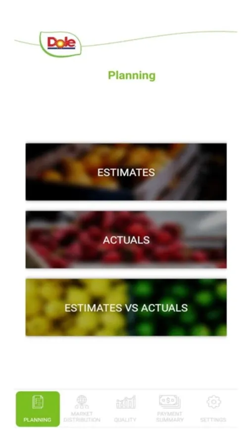 Dole South Africa mobile app ensures our growers are up to date with their latest information. This information is categorised into four sections: Estimates vs Actuals – Payments - Quality Information - Market Distribution. Information updates are done every night with the exception of Payment Information, which updates every Friday at 12pm.