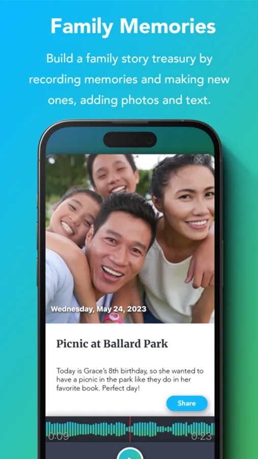 With Sonolog, you create an audio memoir that captures the moments of your life, one detail at a time. These details are recorded in your own words — your own voice — rather than simple text.