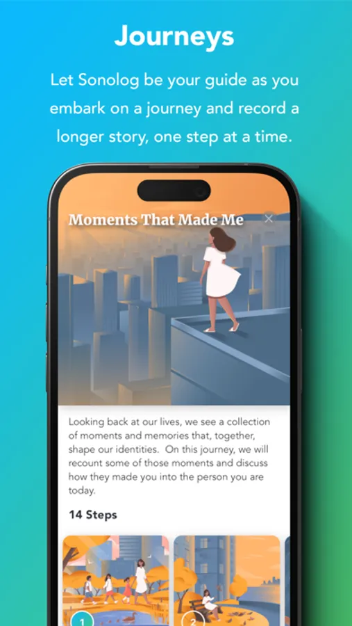 Or, if you want to tell a longer story, Sonolog can help with that, too! Embark on a JOURNEY, where Sonolog guides you step-by-step through a series of prompts around a particular theme you'd like to explore. When you've finished all the steps and completed the Journey, listen back and reflect upon how these steps connect and create a larger story in your life. You'll be amazed and how the stories of your life are connected when you take a wider perspective!