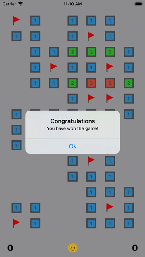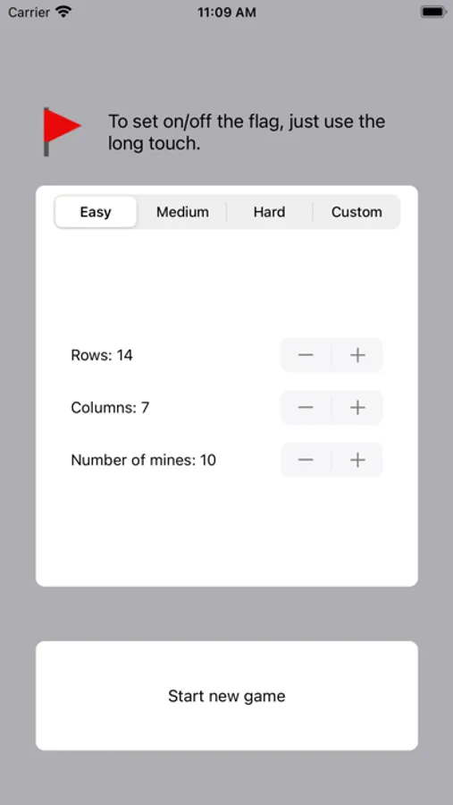 Choose the appropriate difficulty of the game and clear the field from mines. Use a long tap to set or clear the flag.