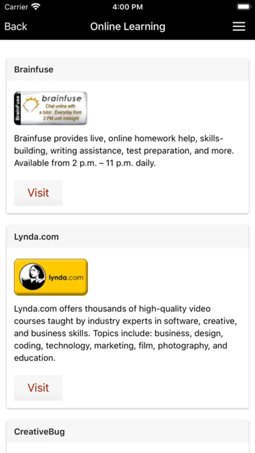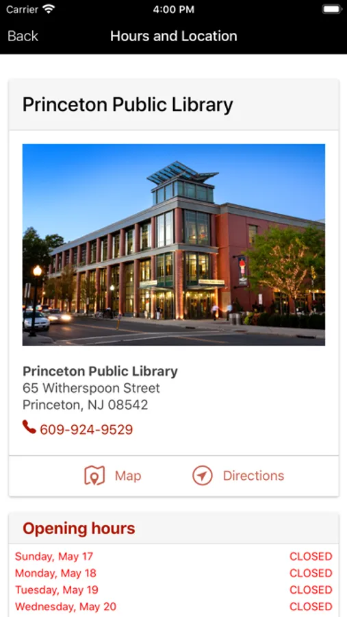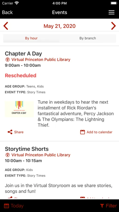 - Events: Get information about the library, upcoming events & programs, and add reminders.