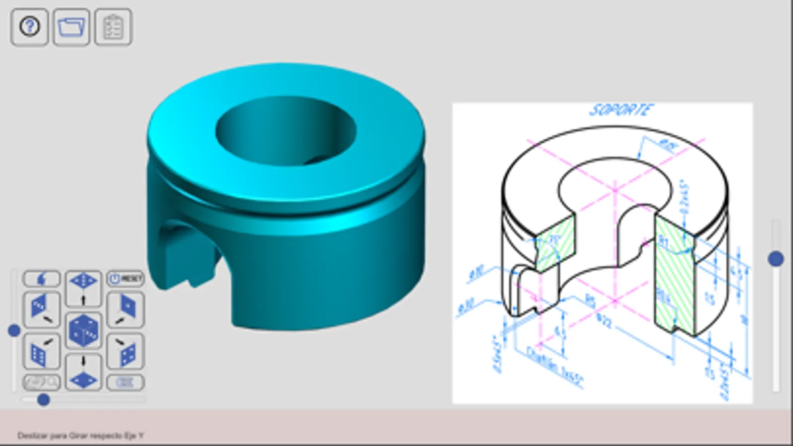 Existe otra escena en la que se trabaja con cada despice de manera individual, mostrando su plano de definición formal y dimensional y con la opción de cambiar el punto de vista y eliminación de un sector de la pieza para ver su forma interior.