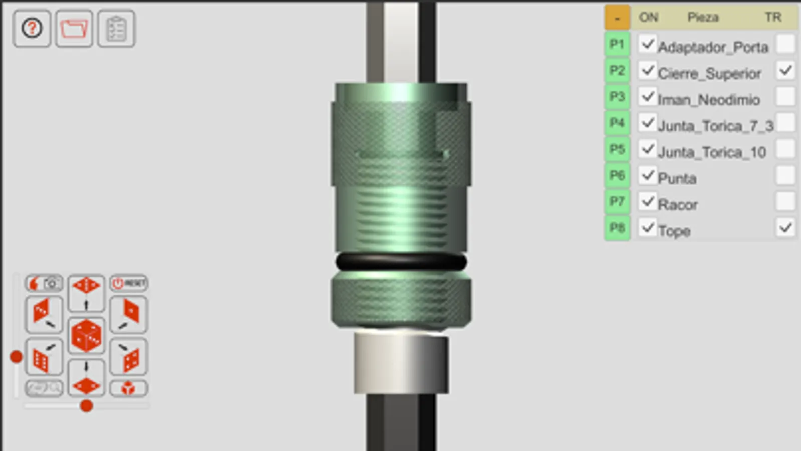 En la escena de visualización del conjunto se trabaja con el ensamblaje como un todo, siendo posible cambiar el punto de vista, girándolo o desplazándolo respecto de los tres ejes coordenados. Además, es posible ocultar o mostrar cada pieza del conjunto, con posibilidad de modificar la transparencia para ver detalles interiores ocultos por superficies exteriores.