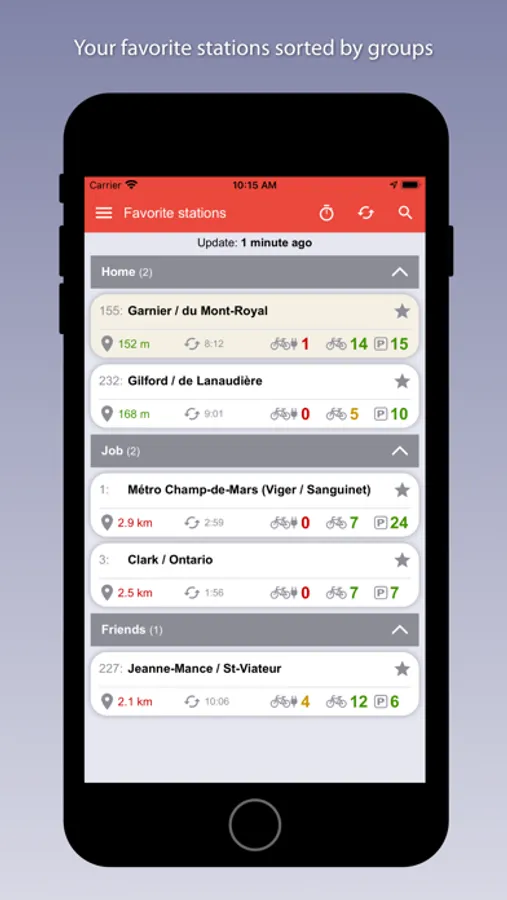 - List of favorite stations categorized by groups (home, work, friends or general).
