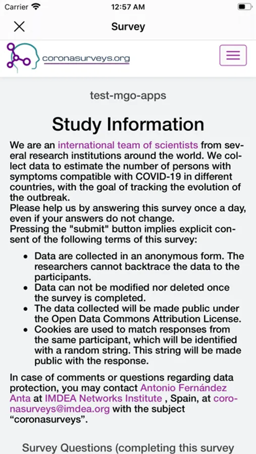 The CoronaSurveys project is a collaborative research project involving several universities and research institutions. Data about COVID-19 cases is collected via anonymous open surveys. The main questions we ask are: