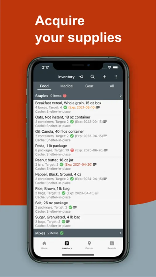 • Inventory views show progress towards your prepping goals