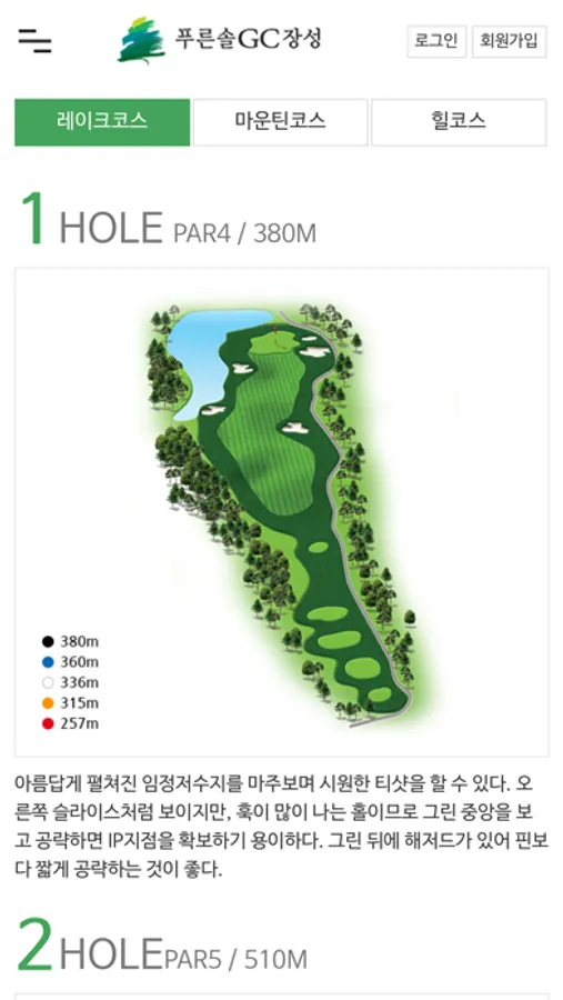 임정저수지와 40만여평 구릉지를 이용해 그곳에서 자생하던 푸른 솔나무를 최대한 살리고, 클럽하우스도 자연과 일체 되도록 건축하여 자연 친화적인 고품격 골프장을 조성하였습니다. 임정저수지와 새로 조성된 8개의 호수를 이용한 레이크코스, 주변의 푸르른 자연경관을 내려다 보면서 플레이 할 수 있는 마운틴 코스,산과 호수가 어우러진 힐코스가 있으며 18홀을 기준으로 하여 7,200yard가 넘는 시원스런 코스가 마련되어 있습니다.