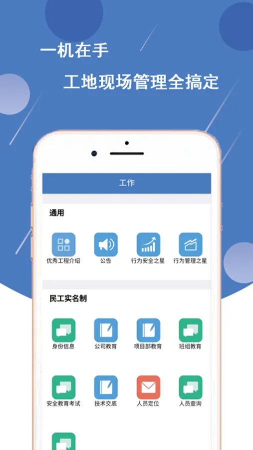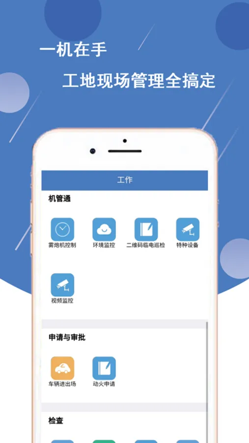 智慧工地现场管理软件,一机在手,工地现场管理全搞定!特种设备巡检、智慧二维码、车辆进出场管理、各种审批、环境设备控制、现场视频监控,视频控制,建筑工人实名制,技术交底,技术培训,教育考试、行为管理之星、行为安全之星、随手拍、动火申请、安全日志、质量日志、安全整改、质量整改。