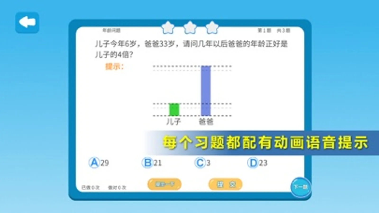 为了达到这个目的,APP里每一个练习题,都配有动画语音提示,在孩子不会做的时候,不急着去直接给出答案,而是先给点提示,以此来启发孩子的数学思维,帮助孩子养成热爱思考的习惯。提交答案以后,系统会自动批改,然后给出详细的动画语音解析和完整的正确答案。每次练习的题目,都是根据孩子以前做题的情况,由程序智能选出。没做过的,不会做的或者是做错的,将会优先推送给孩子。并且,每次题目的答案都会随机变化,以方便孩子反复练习。