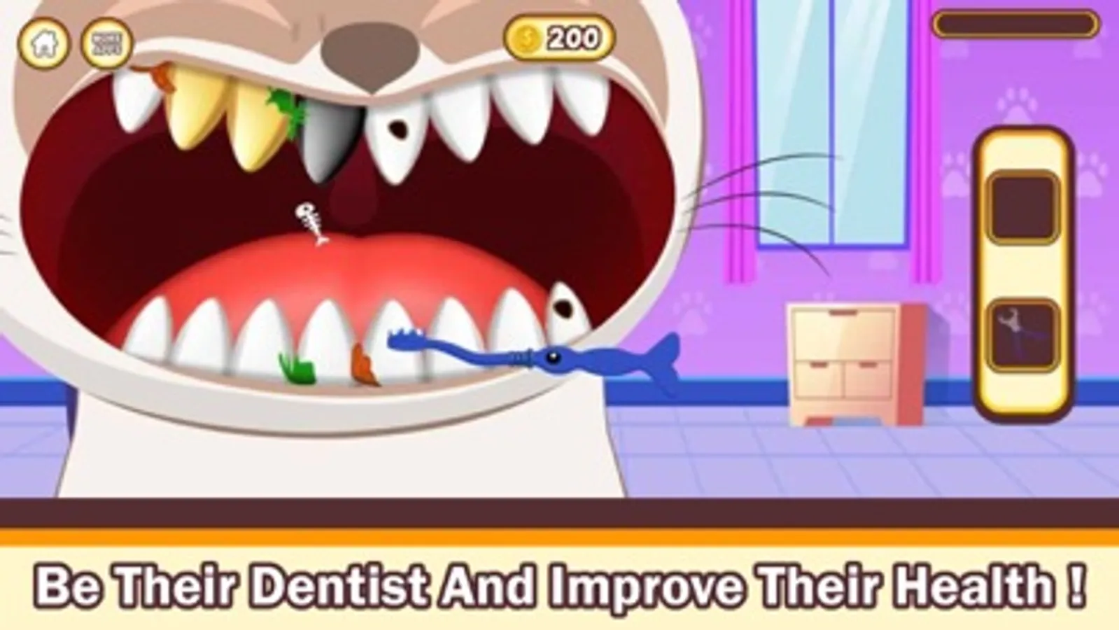 – Play dentist and perform dental care like teeth cleaning and black tooth extraction removing foods.