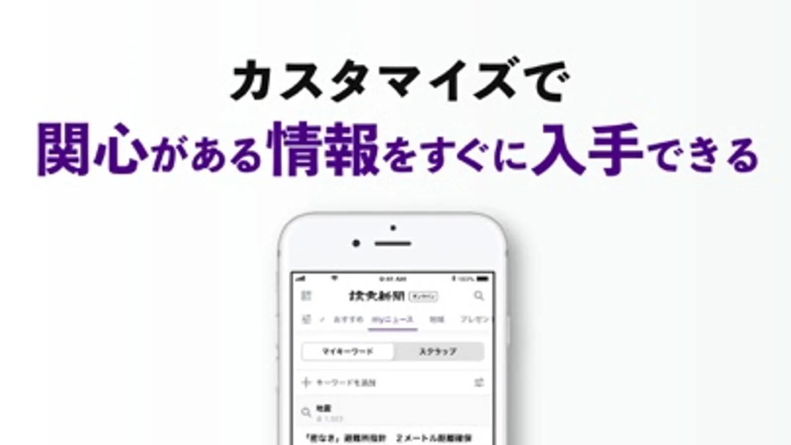 アプリに表示するコンテンツも自由にカスタマイズ可能なほか、キーワードの登録で記事が自動収集されるmyニュース機能や、記事を保存できるスクラップ機能も搭載。読み逃しの心配もなくなります。