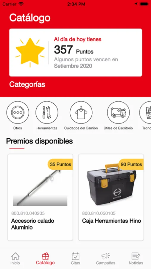 Después de cada servicio de mantenimiento preventivo y/o correctivo en los concesionarios oficiales de Hino, obtendrás Hino Puntos y podrás visualizarlos directamente desde tu Hino APP. Acumula los Hino Puntos para que luego los canjees por los productos que Hino Perú tiene para ti. ¿Quieres saber cuáles son? Puedes encontrarlos en el catálogo de productos.