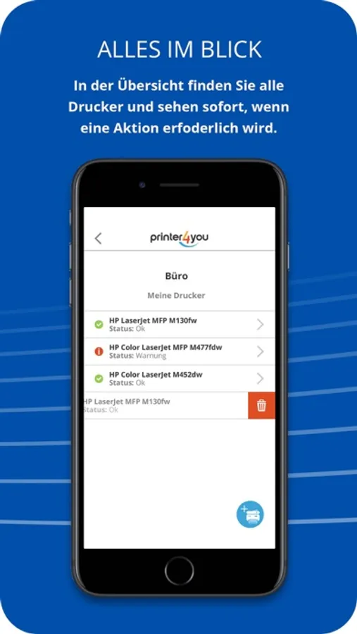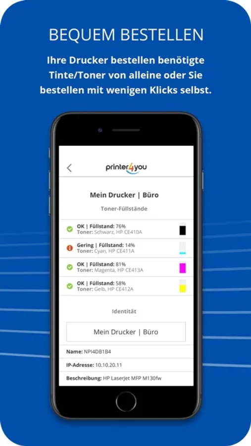 Mit der printer4you.com App bekommen Sie die volle Transparenz über alle Verbrauchsmaterialien Ihrer Drucker. Wenn Sie es möchten, bestellen Ihre Drucker von selbst neue Tintenpatronen oder Tonerkartuschen, so dass Sie sich auf andere Dinge konzentrieren können. Die Nutzung ist für Sie kostenlos und ohne Verpflichtungen. So erlangen Sie ganz einfach den Überblick über Nutzung, Kosten, Füll- und Zählerstände Ihrer Drucker.