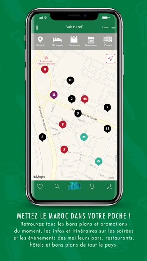 L'application mobile Rak 3aref vous aide à trouver les établissements et les coins branchés à proximité ( restaurants, pubs, magasins, hôtels, épicerie...) qui vous proposent votre bière favorite la Flag Spéciale.