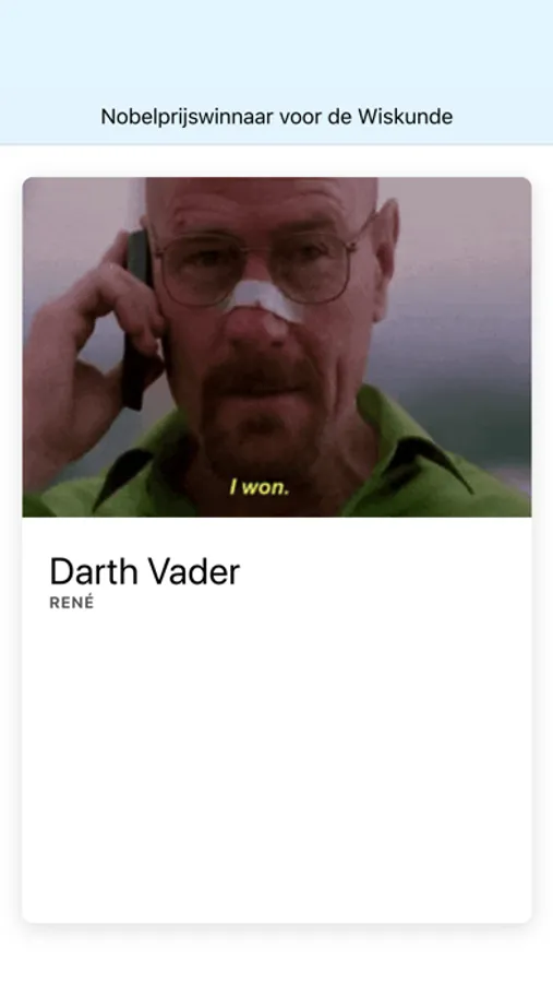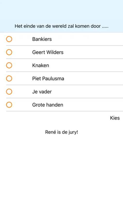 Je krijgt telkens een zin te zien en opties. Kies de beste optie. Een vriend is jury en bepaalt wie het grappigst is. Wie het vaakst de grappigste optie kiest, wint. Probeer dus in te schatten wat het jurylid het grappigst vindt om te winnen.