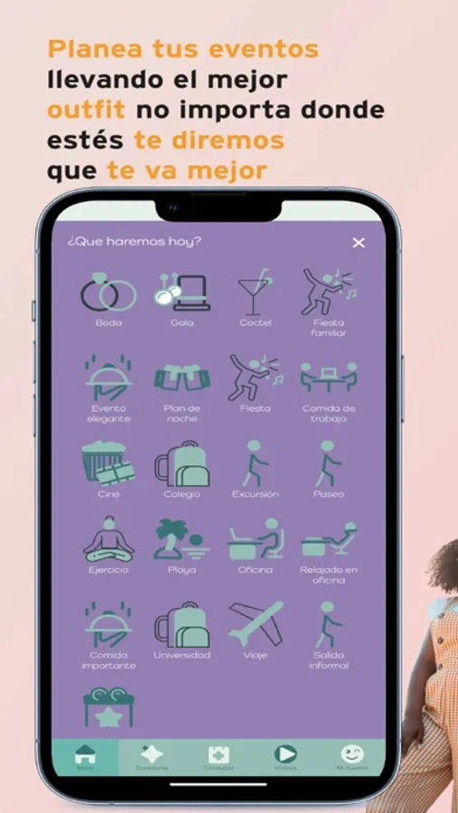 Es un consultor de imagen en tu mano totalmente personalizado. No es necesario tomar fotos ni subir tu guarda ropa ya que utiliza tu propio estilo, colorimetría y tipo de cuerpo. Te sugerimos distintos Outfits tomando en cuenta el clima y el tipo de evento al que asistir.