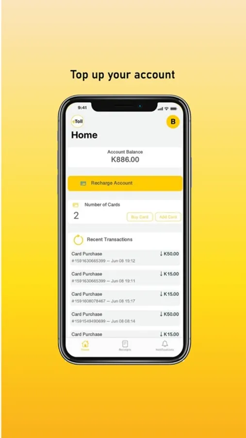 Use your eToll App and card to pay for road tolls securely and conveniently. Every time you pass a toll plaza, you simply swipe your card and go. Your receipts can be viewed on your App and exported as needed. When funds run low, just top up your account using your payment method of choice and you are good to go!