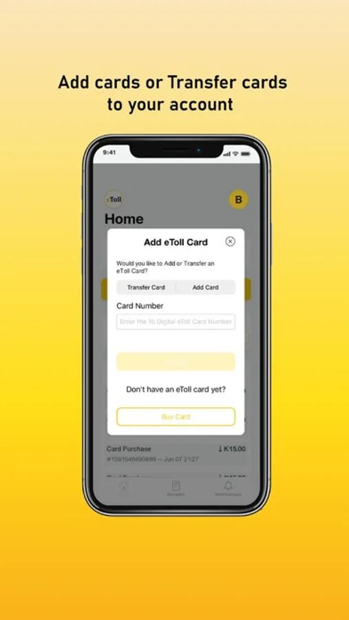 The eToll Zambia App gives you the experience of going cashless as you make tollgate payments in Zambia. Once you download the App, add your eToll card, if you have one, or use the App to order a new card. You can top up your account using mobile money or your bank debit/credit card.