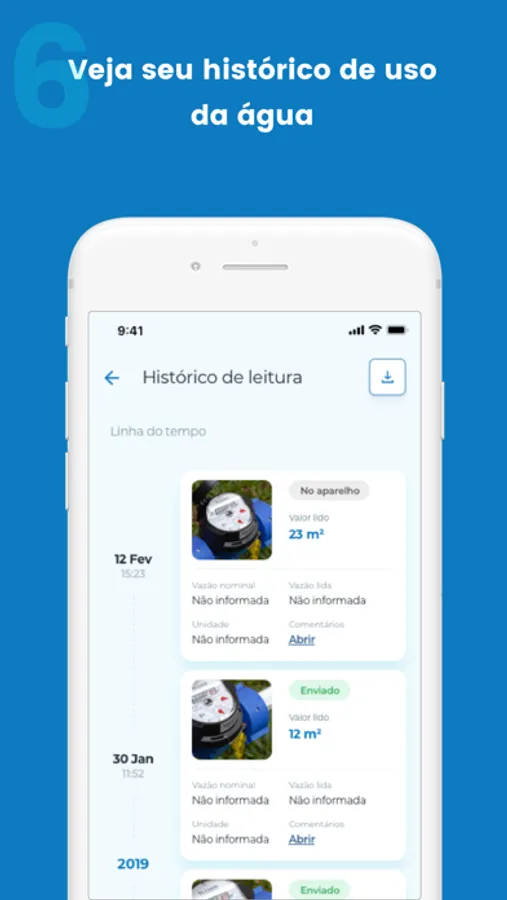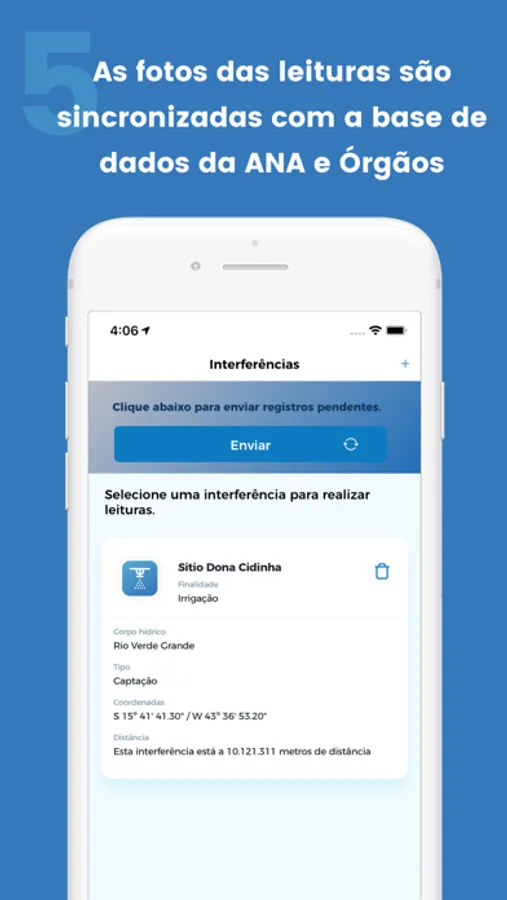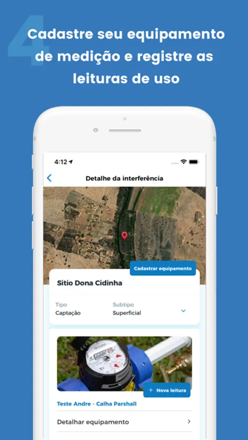 O usuário pode acessar seu empreendimento com sua senha do sistema CNARH ou de seu registro no gov.br. Ao acessar, identifique suas interferências (captações de água) pelo nome, tipo e coordenadas geográficas. Depois, cadastre seus equipamentos de medição selecionando da lista de opções disponíveis, e registre fotos do visor do equipamento e insira os dados de volume lidos diretamente no equipamento. Opcionalmente, insira dados da vazão nominal da bomba (registrado na placa) e de vazão instantânea, que serão usados como referência para cálculo de volumes. Sempre que houver conexão com a internet, os dados serão automaticamente atualizados.