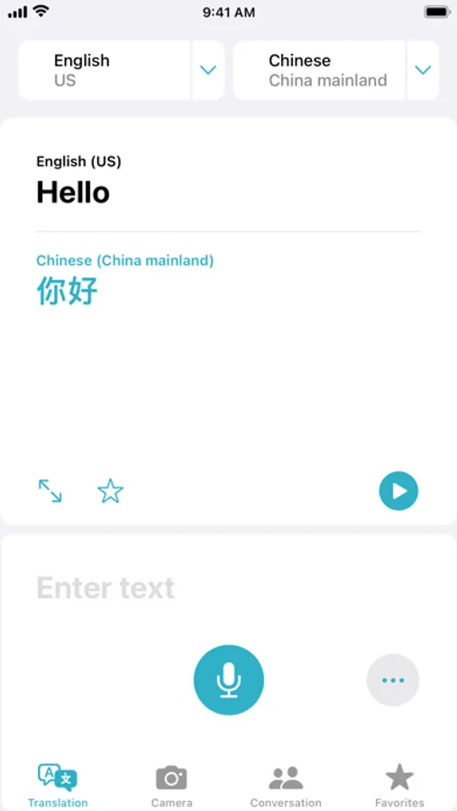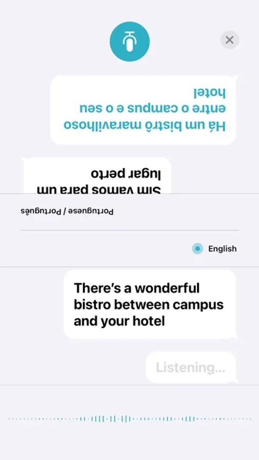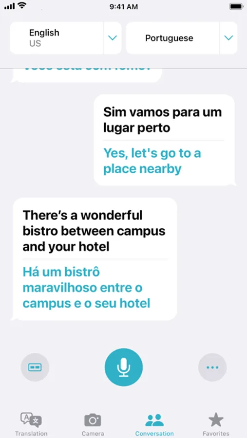 • Conversations - In the Conversation tab, tap the single microphone button to speak, and automatic language detection will transcribe what you say in chat bubbles on the correct side of the conversation