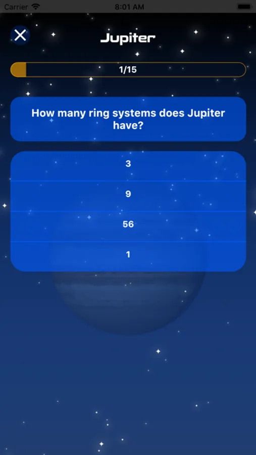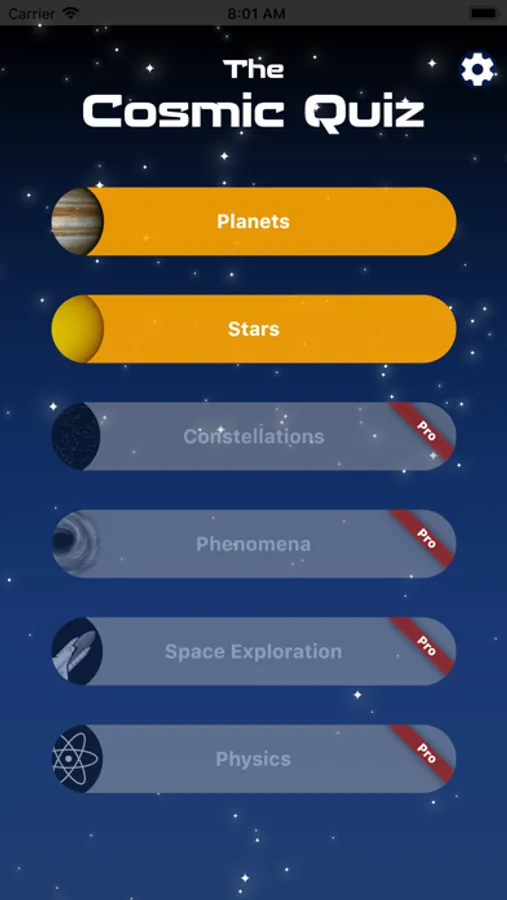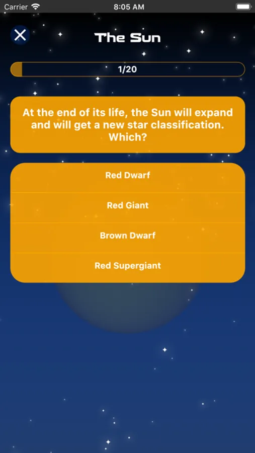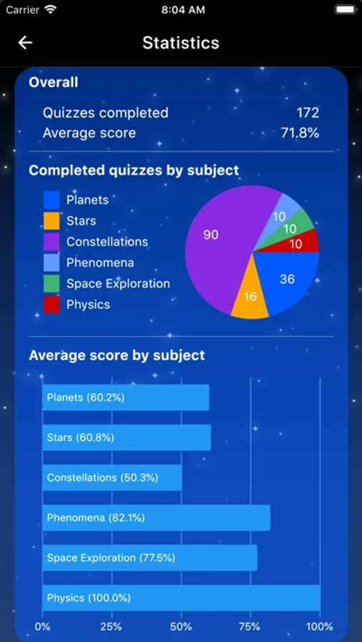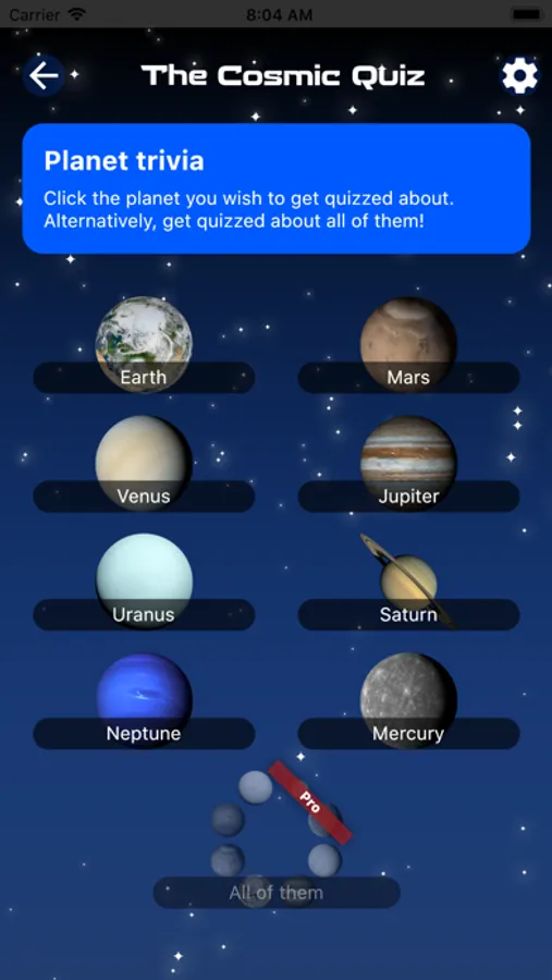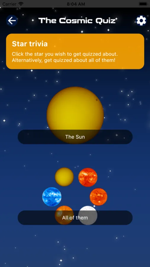 Challenge your planetary or stellar knowledge in this quiz app about the universe. In addition you can also check out your quiz statistics to see how you are progressing!