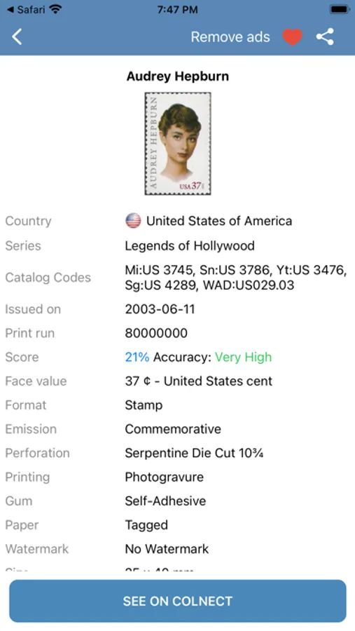 Are you a stamp collector or just want to know more about a stamp you see? Stamp Identifier uses advanced image recognition technology to find that stamp and provide you more details about it, courtesy of colnect.com, a social network for worldwide collectors which has the world's largest online stamp catalog.