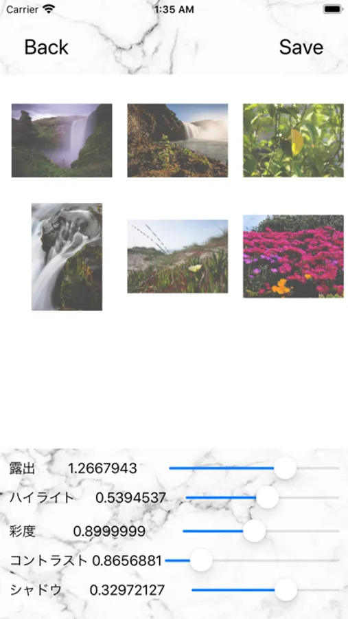 エディトボタンを押し、画像にかけたい編集機能のスライダーを動かす→カメラロールに保存する