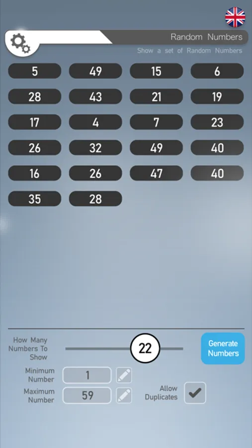It will display a set of up to 32 numbers all picked from a minimum and maximum value, press the button to regenerate them. You can choose a number from 0 to 99999 it will also allow duplicates if required.