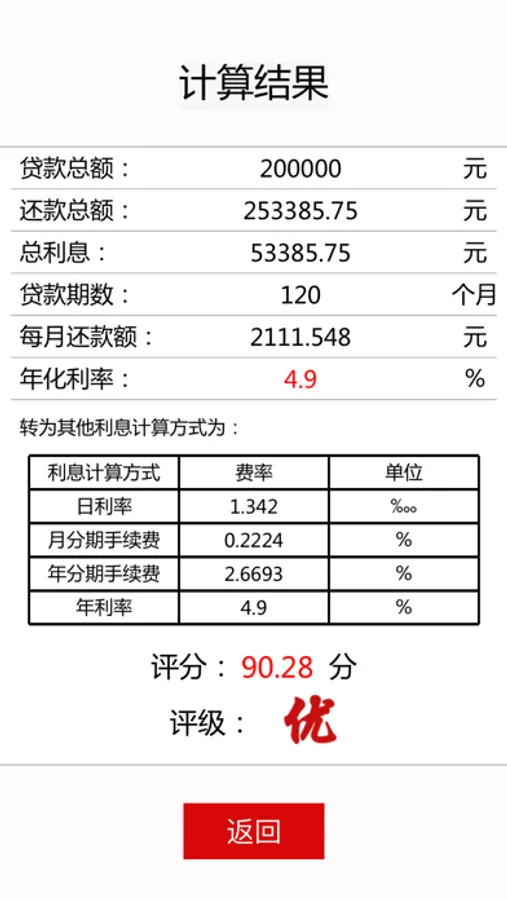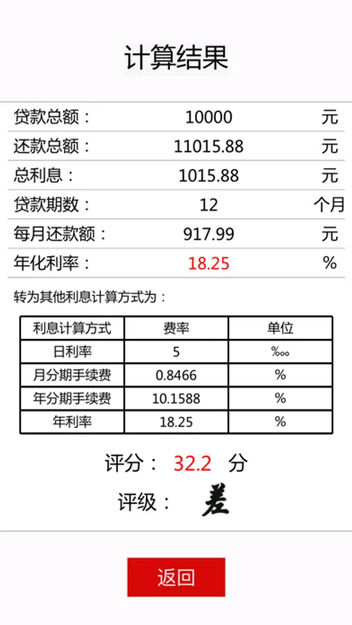 计算结果,会根据不同贷款的优劣,定位贷款对用户的亏损程度,参考市场价值,来给贷款方案打出分数,评定级别!