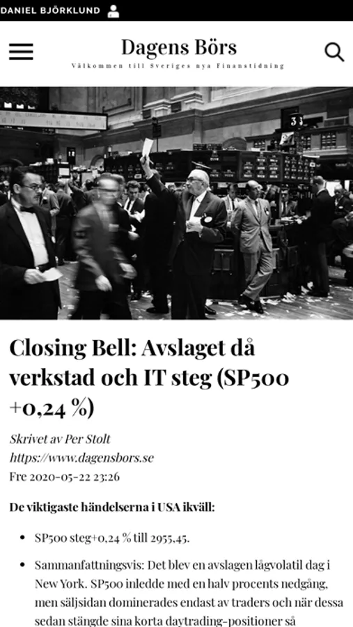 På Dagens Börs hittar du en unik kombination av tekniska och fundamentala analyser samt relevanta nyheter. Du hittar alltså det viktigaste för att dagligen hålla dig uppdaterad om vad som händer inom finansmarknaden. Ambitionen med denna tidning är att erbjuda finansnyheter och finansanalyser i ett tidseffektivt format, utan reklam och politiskt vinklade artiklar. Helt enkelt bara finans och börs.