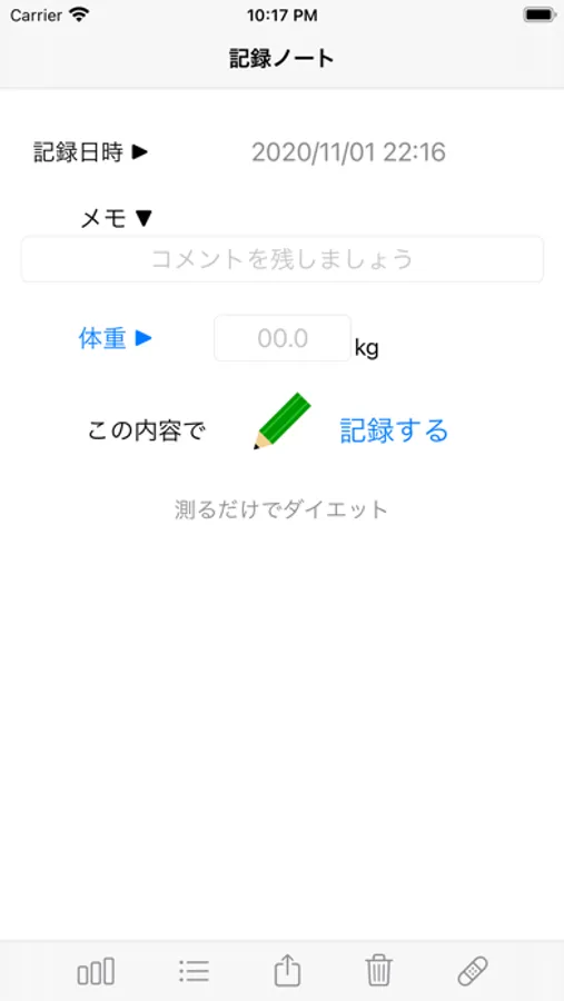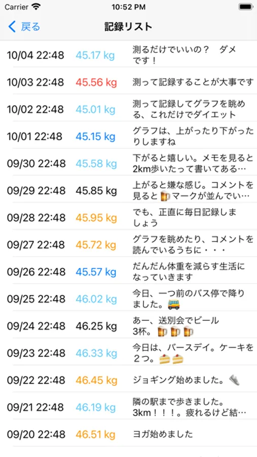 体重を簡単に記録、管理できる超シンプルな記録ツールです。毎日、体重を記録してグラフを眺めるだけで、健康的にダイエットできます。体重(とメモ)を入力したら記録ボタンを押すだけ。記録日数、体重桁数、メモの文字数に制限はありません。記録し忘れても大丈夫。日時を指定して記録できます。間違った記録は、簡単に削除できます。記録したデータをエクスポートするのもボタン一つ。グラフは棒グラフ、折れ線グラフ、どちらでも表示可能。グラフの表示期間は自由に変更可能。シークレット機能で体重の表示を隠せるので、お友達にグラフや記録リストを見せても安心です。シンプル、簡単で、飽きの来ない体重記録ツールです。
