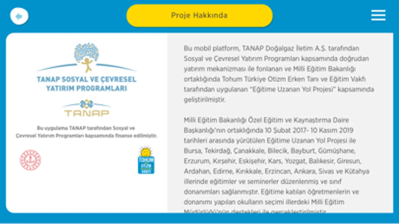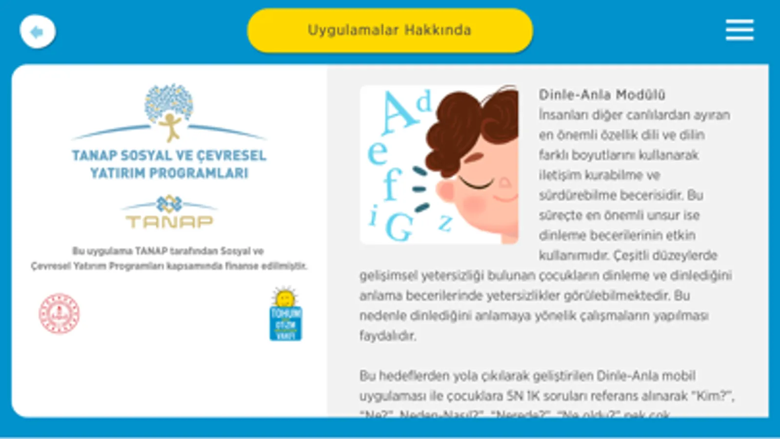 Bu mobil platform, TANAP Sosyal ve Çevresel Yatırım Programları finansman desteği ve MEB ortaklığı ile yürütülen “Eğitime Uzanan Yol” projesi kapsamında hazırlanmış olup; platformda yer alan mobil uygulamalar ile tipik ve atipik gelişim gösteren çocukların bilişsel becerilerinin desteklenmesi ve geliştirilmesi amaçlamaktadır. Bu becerilere yönelik mobil uygulama içinde; dinlediğini anlama, eşleme ve nesne ayırt etme becerilerinin öğretime yönelik içerikler yer almaktadır.