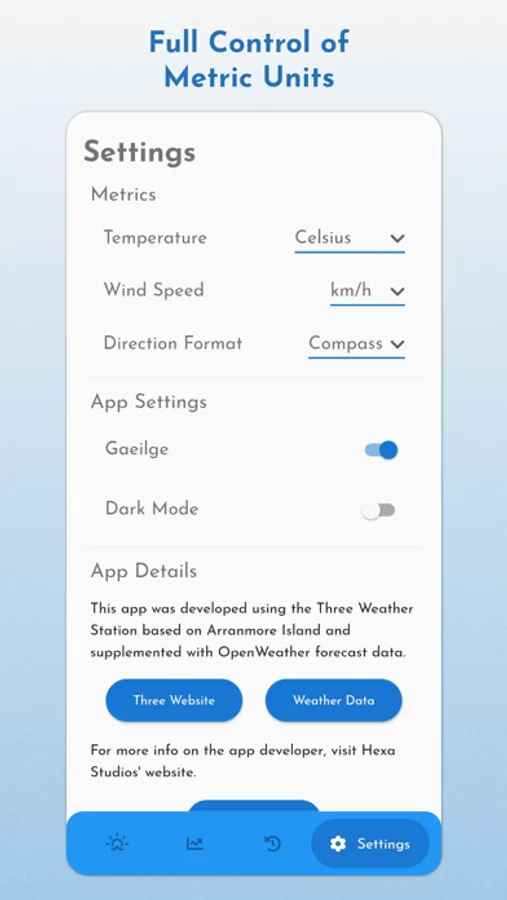 The weather station and data connection were supplied and implemented by Three, links to their web dashboard and the full 30 days of data also feature in the app.